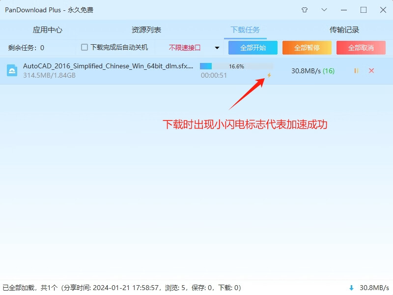 4、就可以跳转到正在下载,查看正在下载的文件。赶快试试传说中的网盘不限速下载解析神器吧,如下图所示: