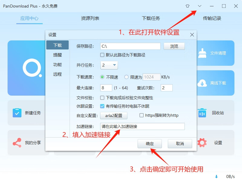 1、用户在网盘上传文件是不限速秒传的,但是下载起来真的很慢很痛苦。别担心,Pandownload可以解决你的烦恼。您只需要进入Pandownload并打开文件的分享链接或登录账号。就可以在当前文件列表中找到您需要下载的文件,但最好在下载资源之前下载,在右上角找到菜单栏中的设置选项,如下图所示: